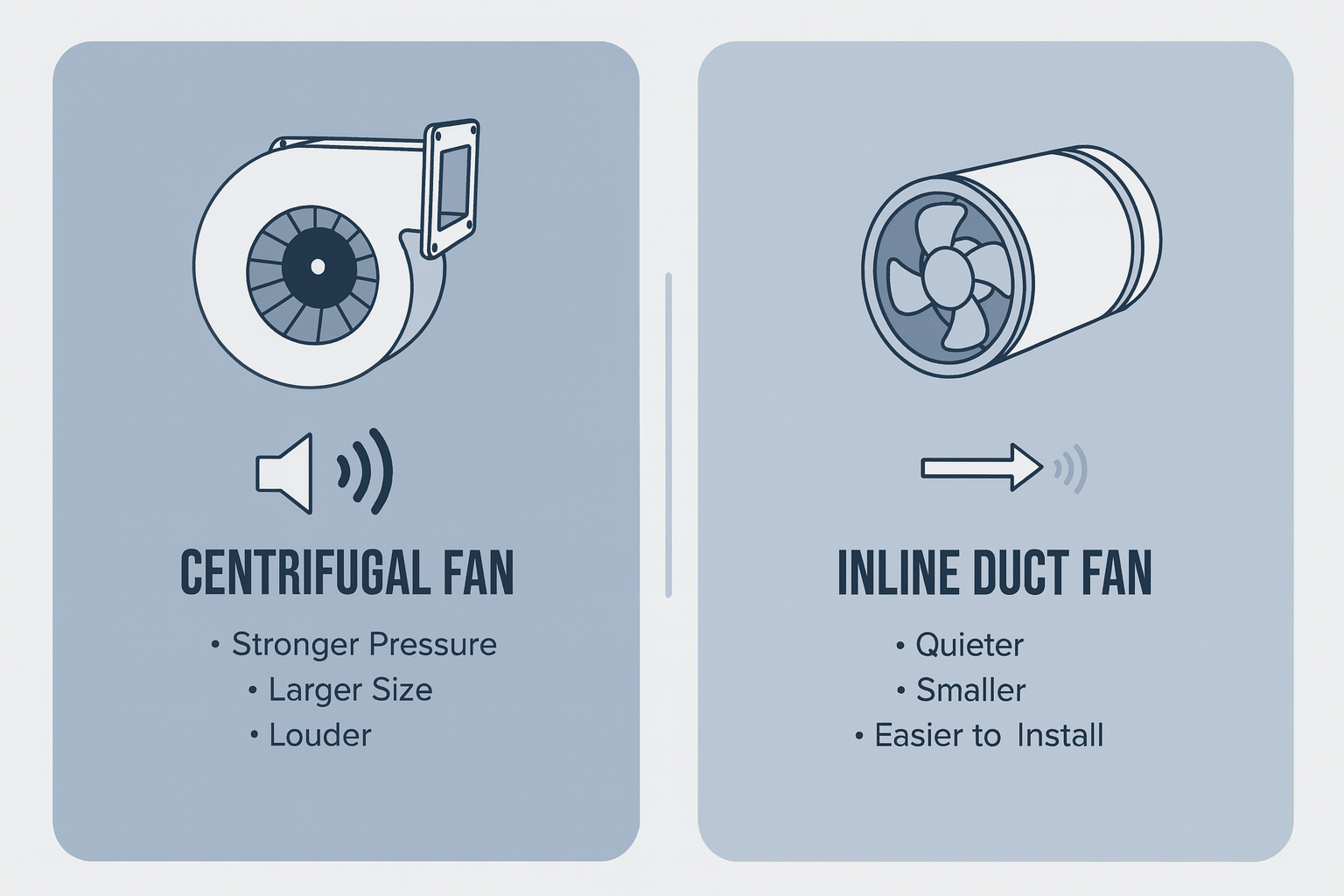 Think of the centrifugal fan as your “power performer” and the inline duct fan as your “quiet helper.” Both are reliable — the choice depends on how much airflow pressure and noise control you need.