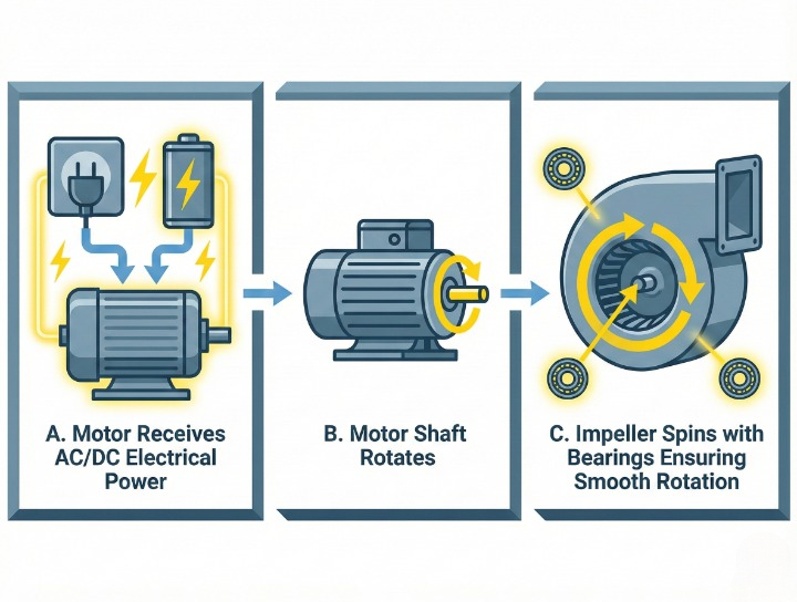 Once the motor turns the shaft, the impeller begins rotating—this is the heart of how the blower works.
