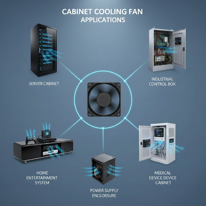 A cabinet fan is a fan installed inside or on the wall of an electronic enclosure. Its main job is to move cool air in and push hot air out, keeping equipment at safe operating temperatures. These fans are widely used in: