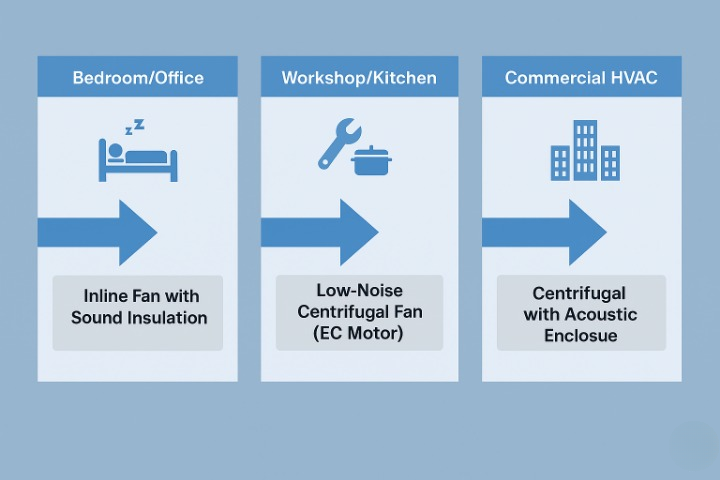 If quiet operation is your top priority (e.g., for bedrooms, offices, or study areas), choose an inline fan with sound insulation. If you need more power but still care about noise, look for low-noise centrifugal fans with EC motors.